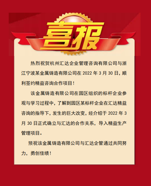 【喜報】匯達企管簽約浙江某金屬鑄造有限公司