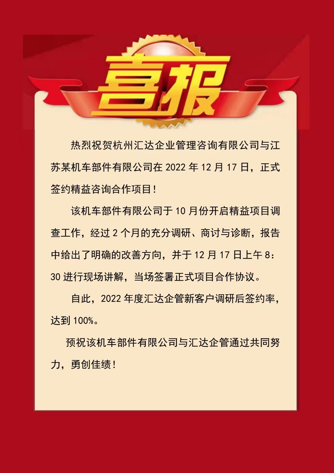 【喜報】匯達企管簽約江蘇某機車部件有限公司